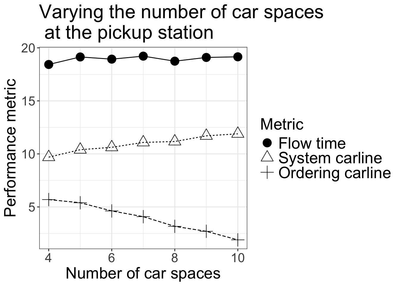 labs(title="Varying the number of car spaces \n at the pickup station",x="Number of car spaces", y = "Performance metric")+