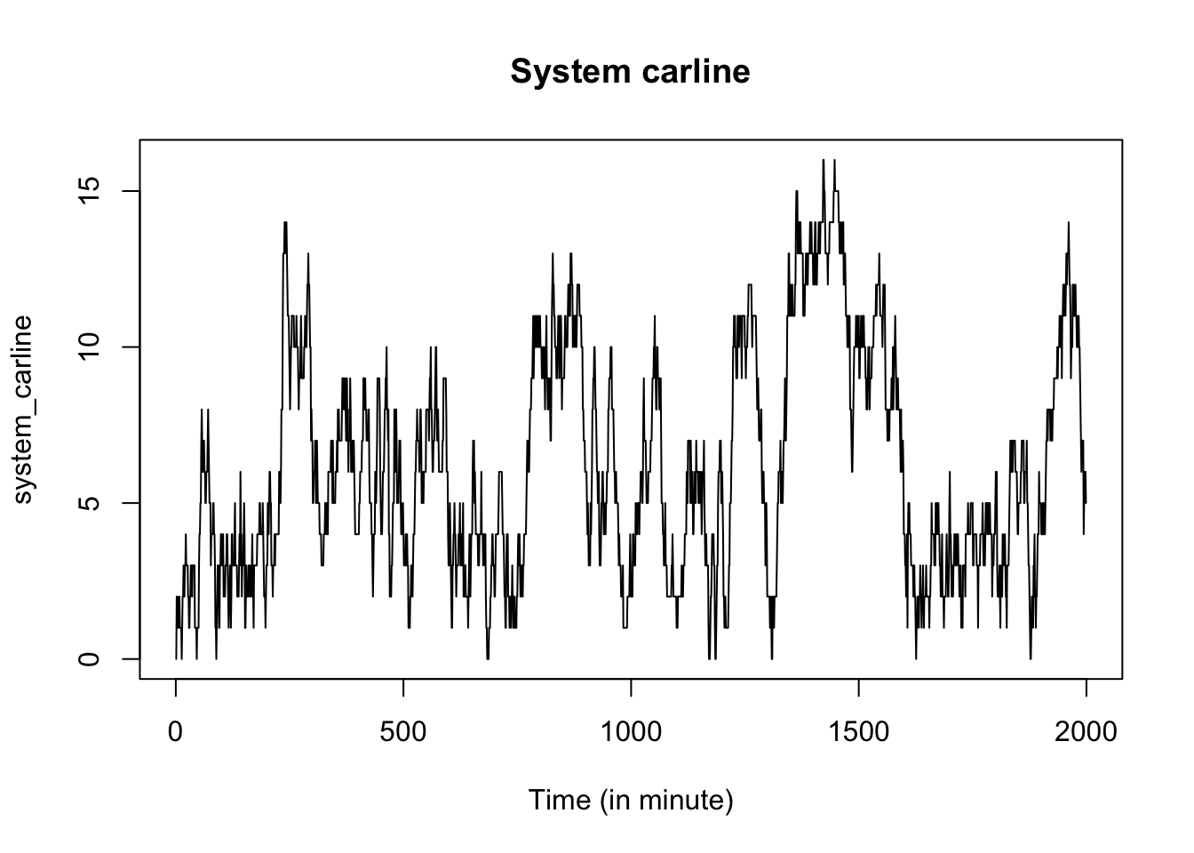 plot(system_carline, type='l',xlab="Time (in minute)",main='System carline')
