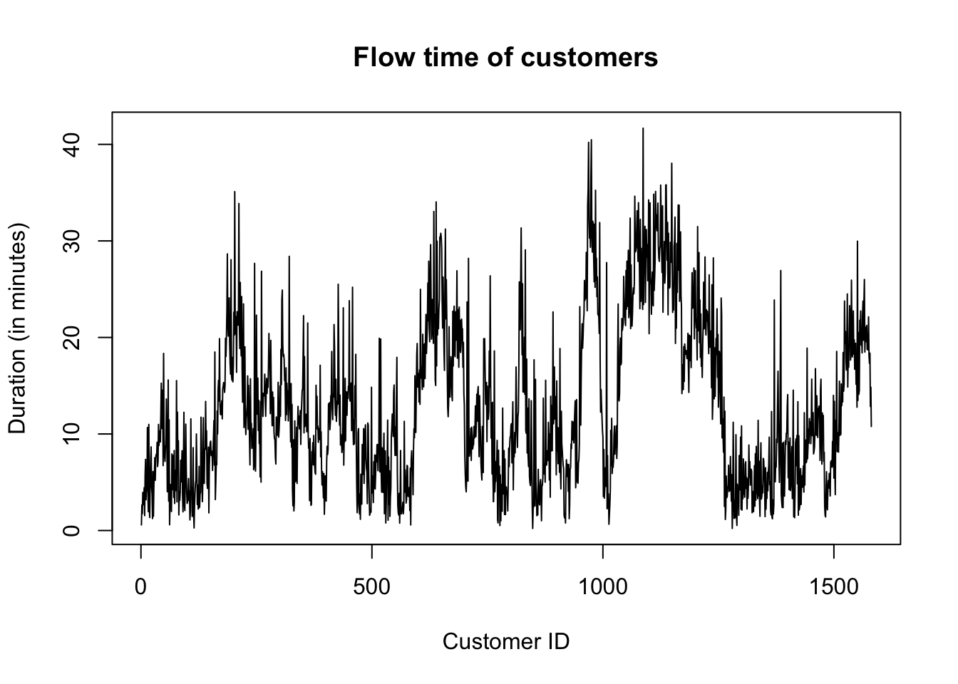 plot(df_arr$flow_time, type='l',xlab="Customer ID", ylab="Duration (in minutes)", main='Flow time of customers')