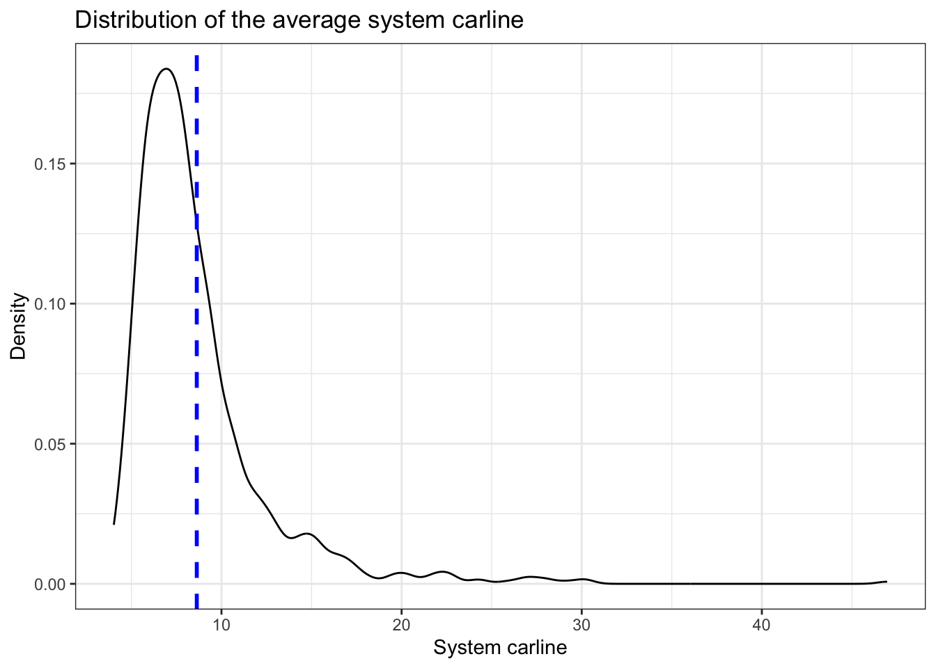 labs(title="Distribution of the average system carline",x="System carline", y = "Density")