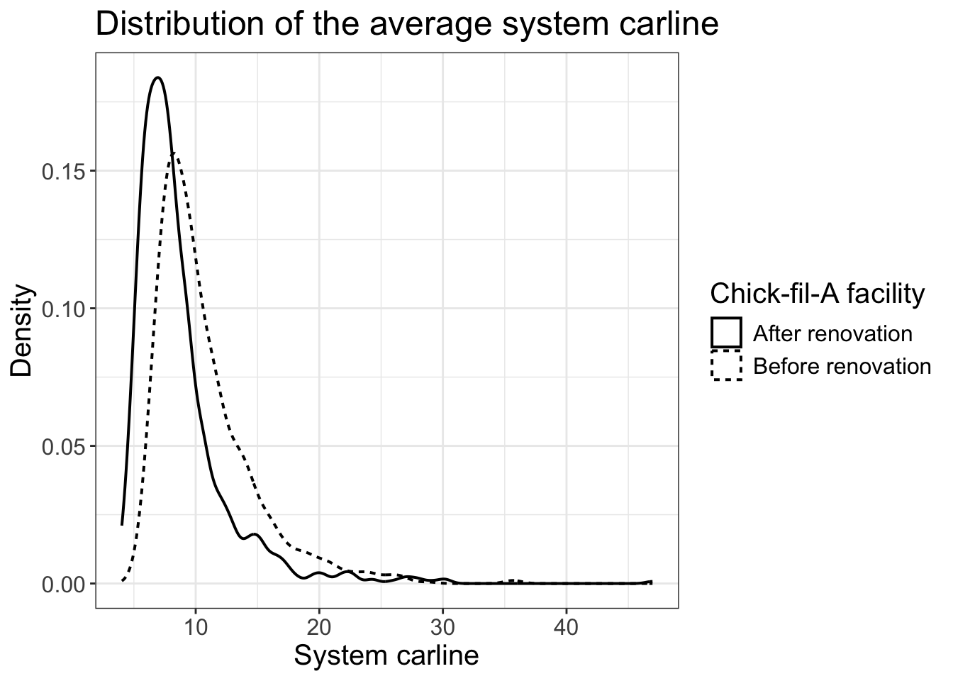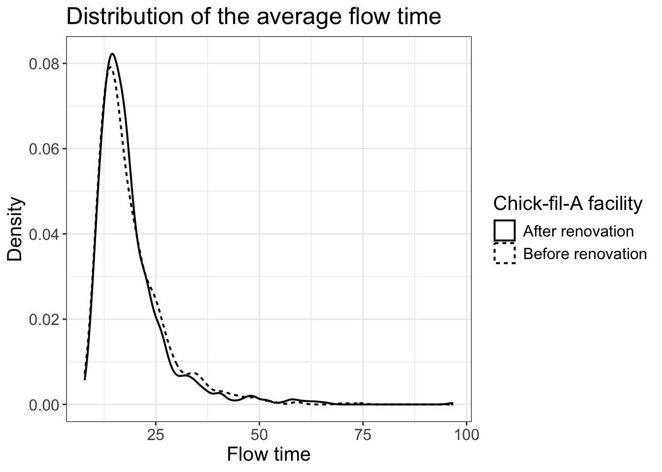 Compared with the metrics before the renovation, the average system carline of the new facility is reduced by 20%, but the average flow time is almost identical. In other words, Chick-fil-A’s new design is ineffective in reducing customers’ waiting time! A formal t-test also suggests that the reduction in the system carline is significant, but flow time distributions before and after the renovation show no significant difference.