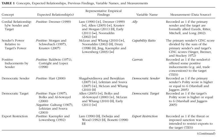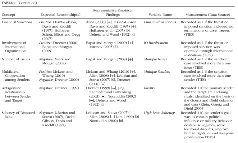 Second, data and operationalization. More specifically, how do we define sanctions success? The success rates differ a lot depending on how we define and code sanctions success. Here is a table taken from Morgan, Bapat, Kobayashi (2014, 546).